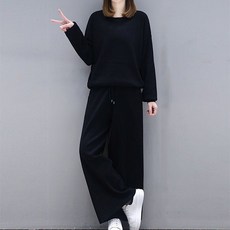 티탁 여성용 빅사이즈 데일리 루즈핏 레이어드 7부 통소매 티셔츠 + 밴딩 와이드 통팬츠 상하의 세트